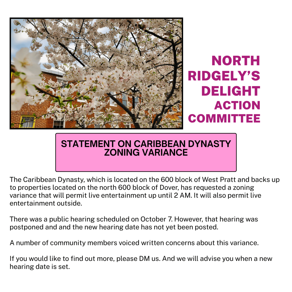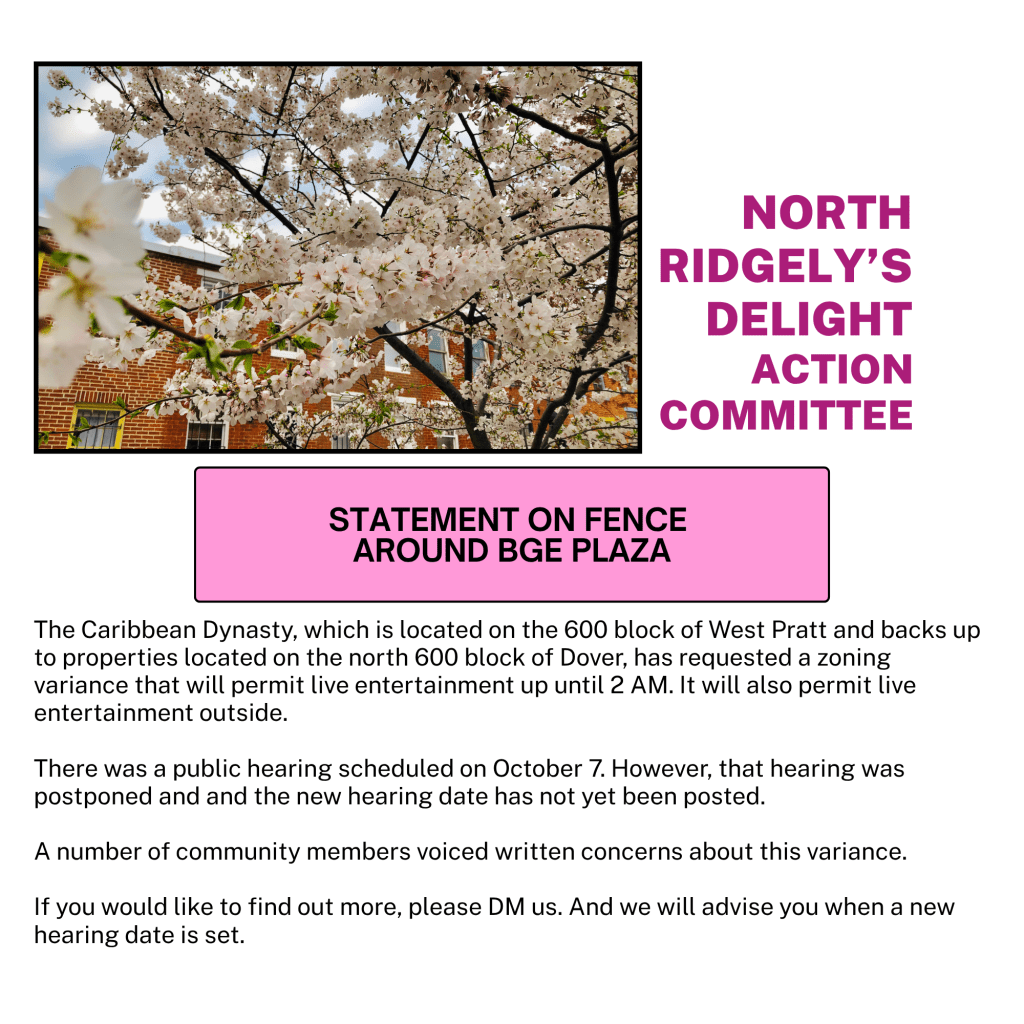 We are the North Ridgely’s Delight Action Committee (NRDAC). We look forward to partnering with individuals and organizations to sustain a vibrant and inclusive North Ridgely’s Delight neighborhood, Baltimore, and beyond.